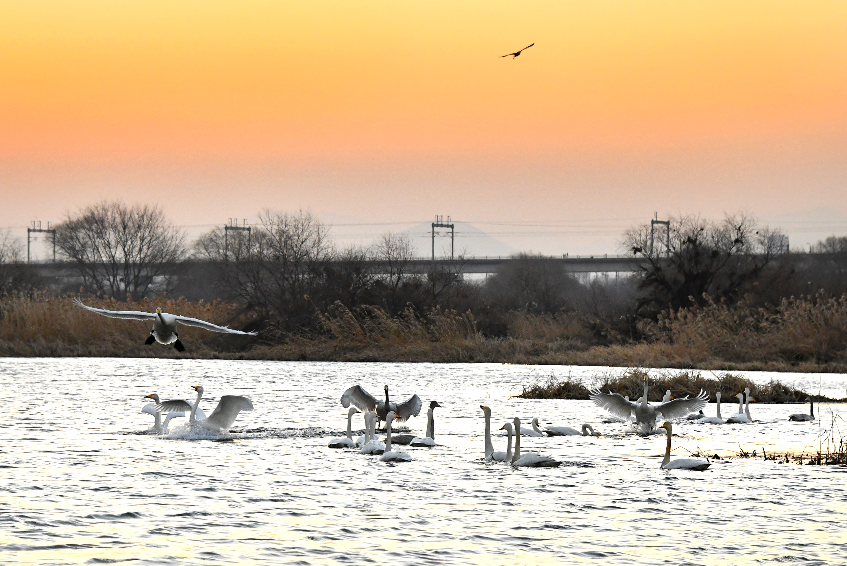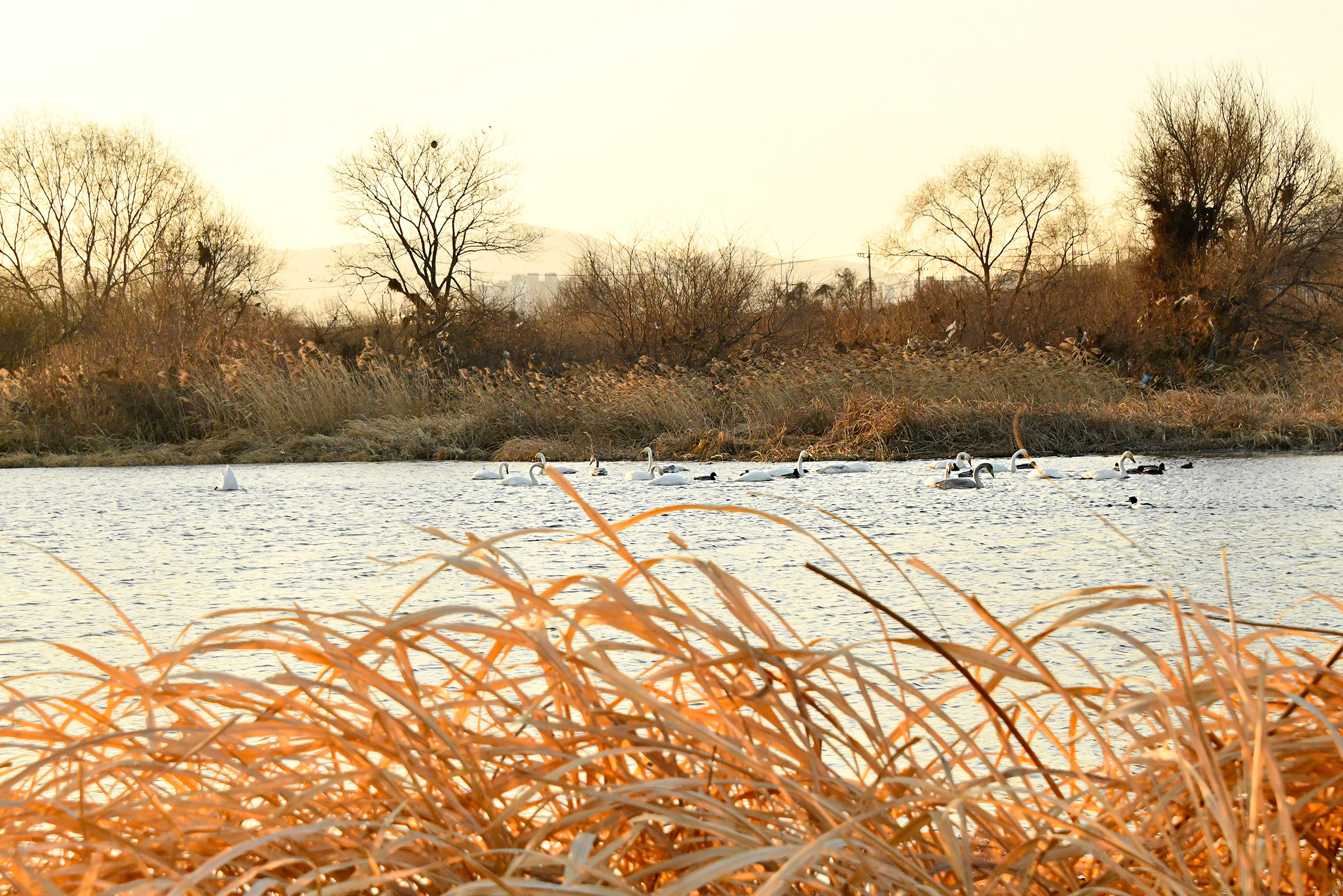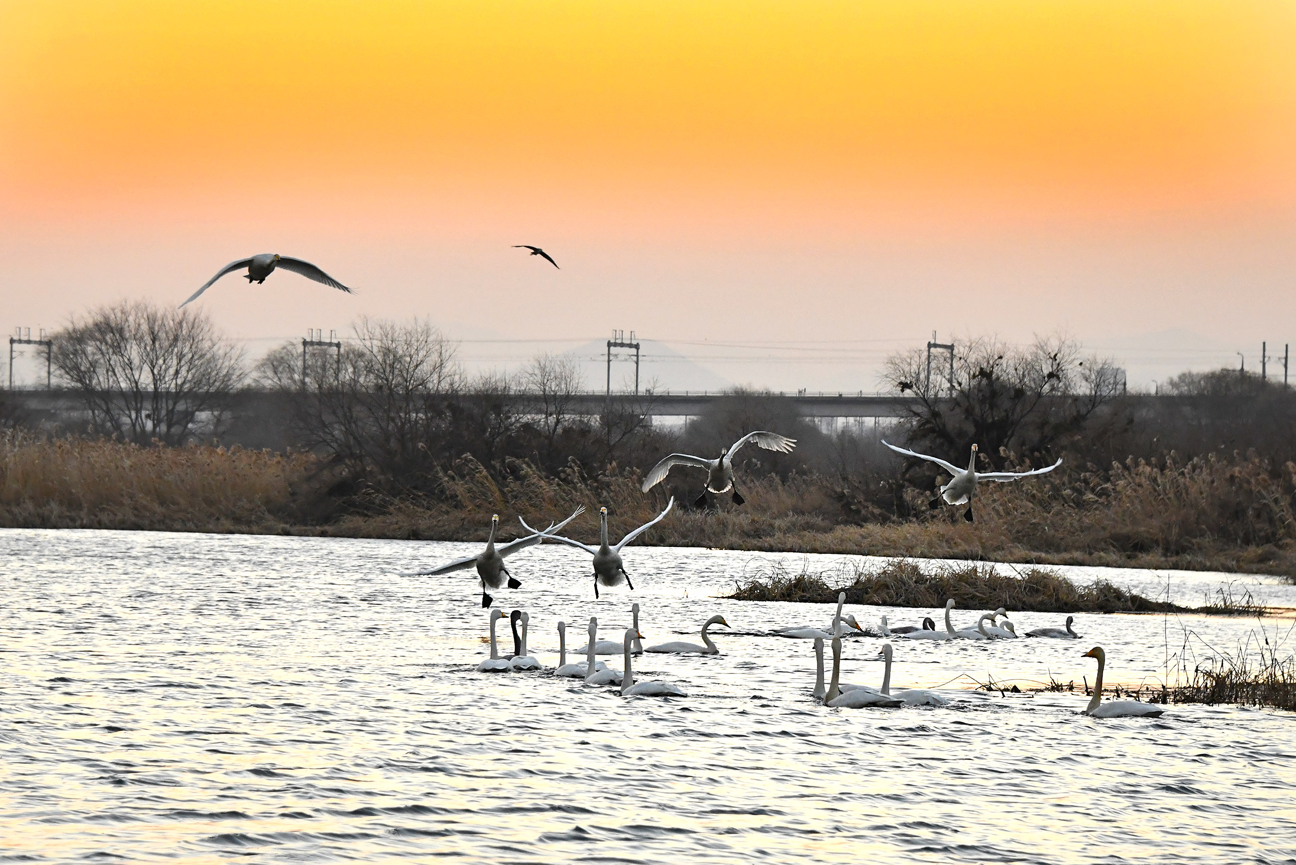 고니들이 다른곳에 있어 차를 세우니 눈치채고 이동중 다른 무리가 들어오는 모습이다.