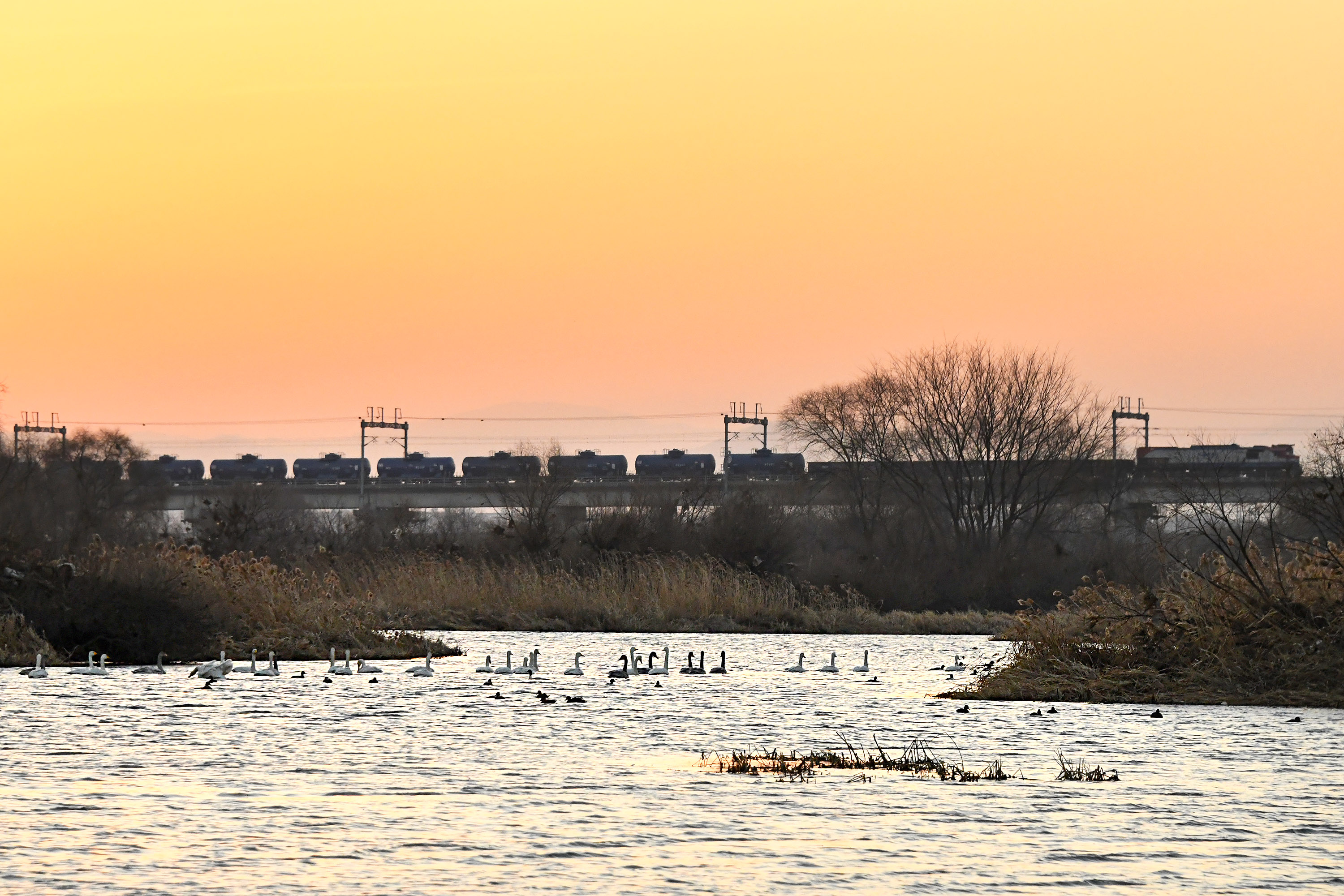 화물 기차도 지나가는 강변에서 일출을 보다