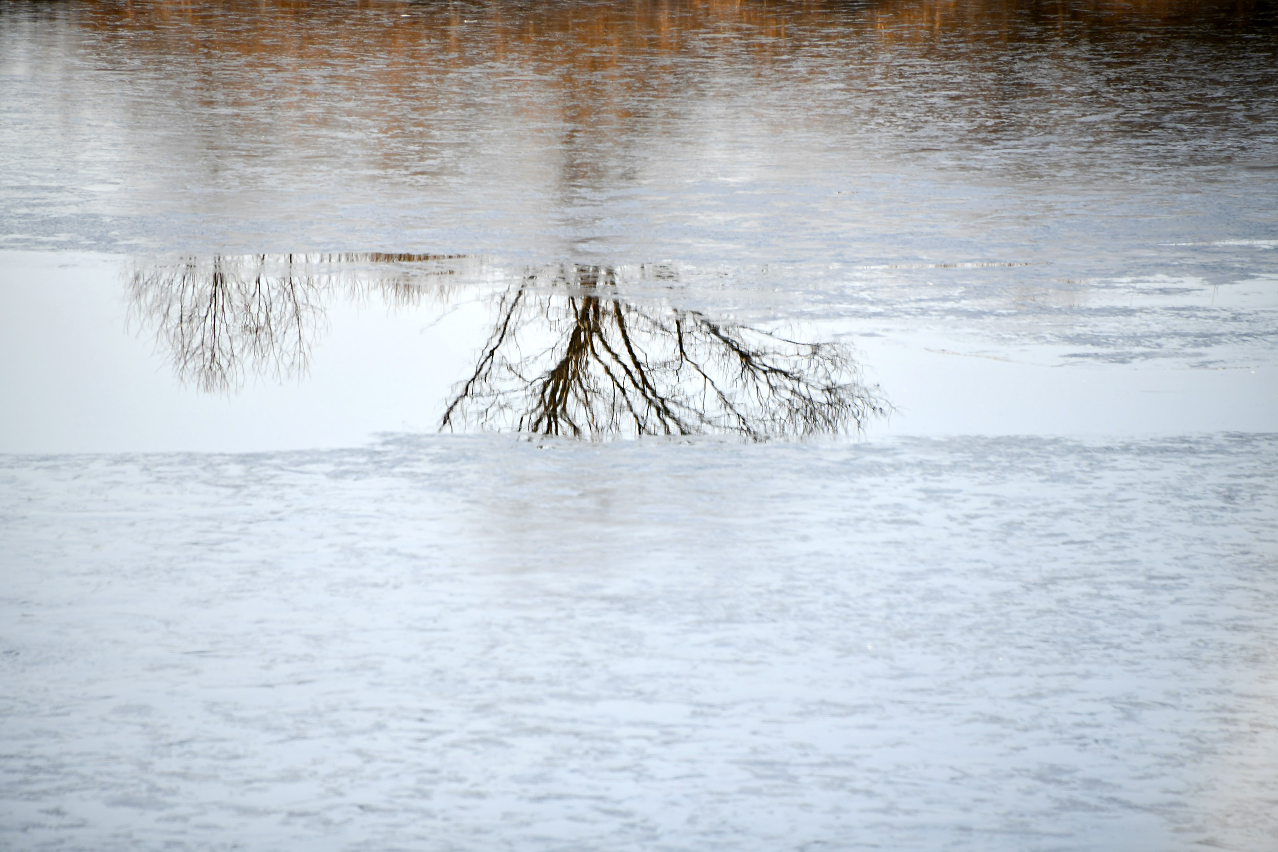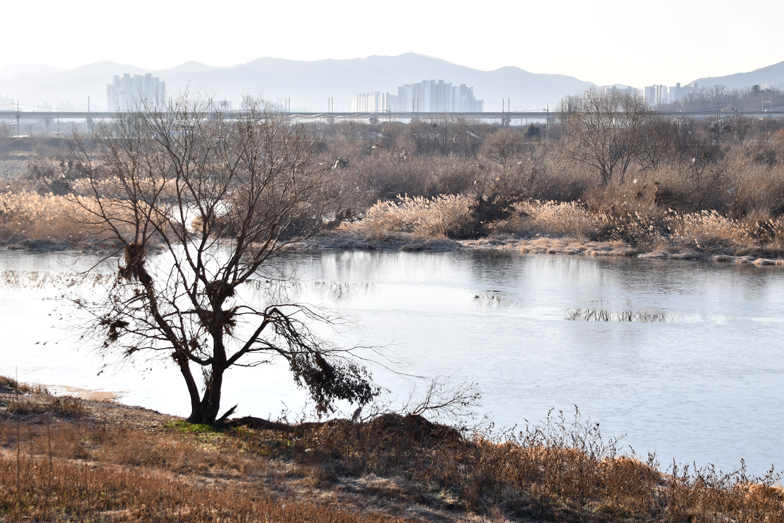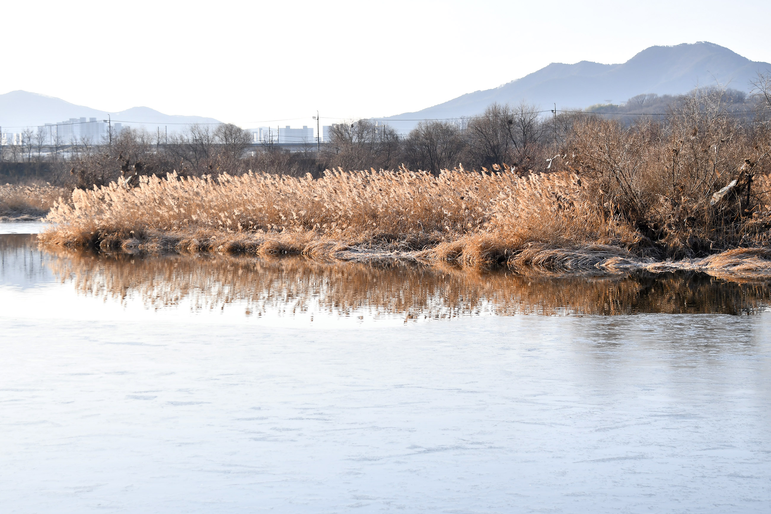 아직 꽁꽁얼지 않은 겨울 강가 풍경이다.