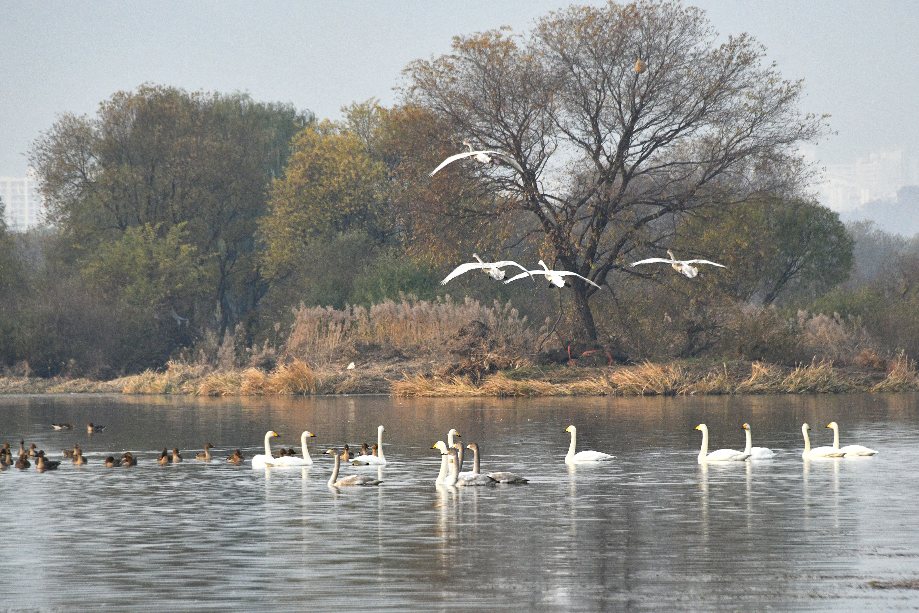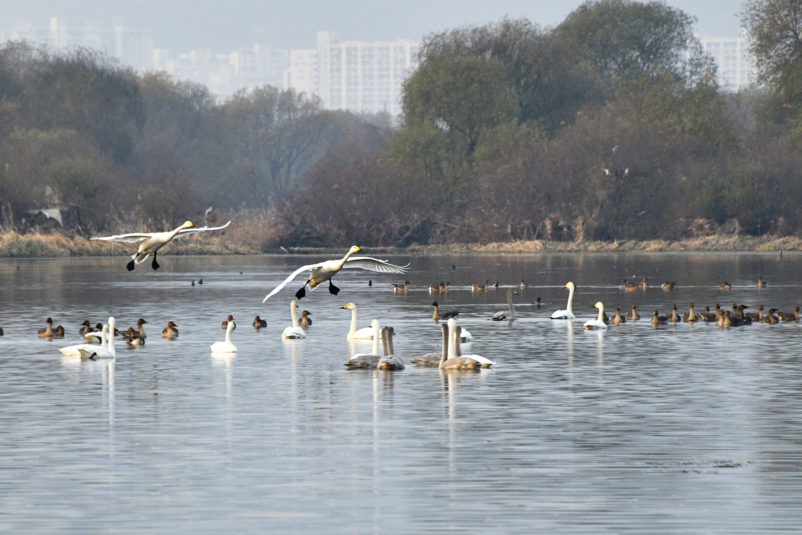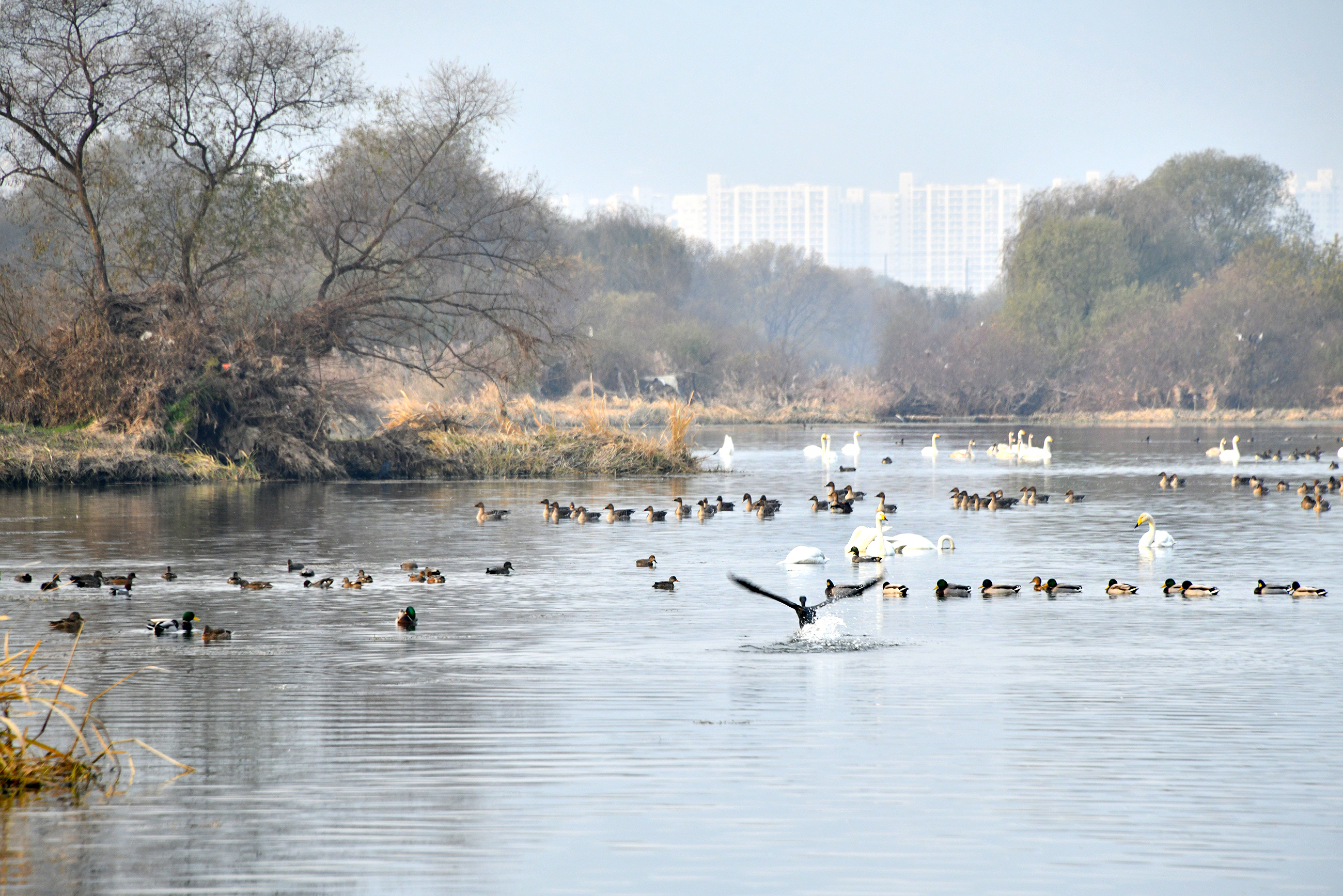 고니와 기러기가 돌아와 한산하던 강이 다시 북적이며 생기가 넘쳐 보인다.