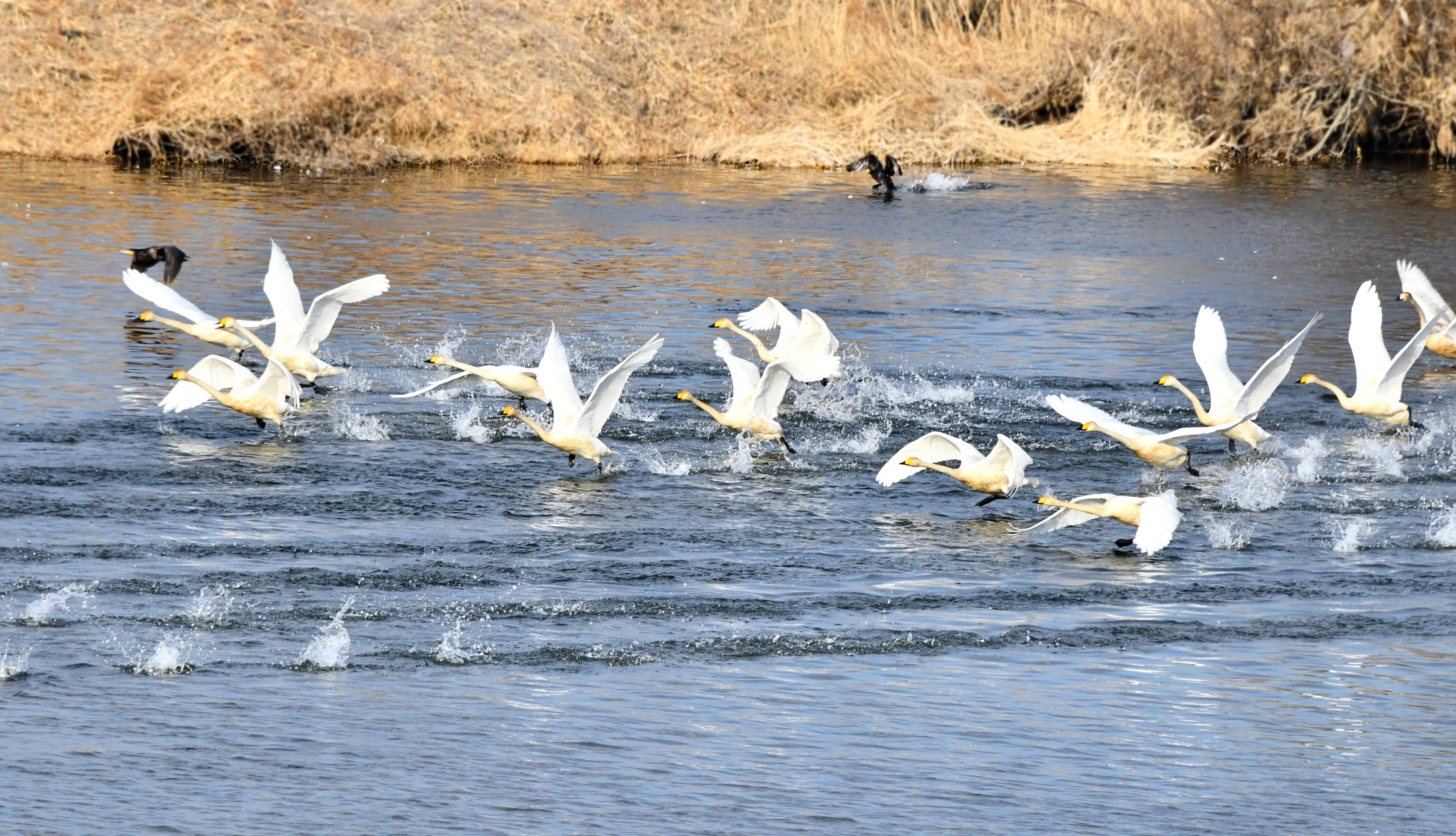 그런데 고니들이 다 고개를 들고 있다. 날아갈것 같아 내려가지도 못하고 뚝방에서 급히 몇장 담았지만 다 날아가 버렸다.