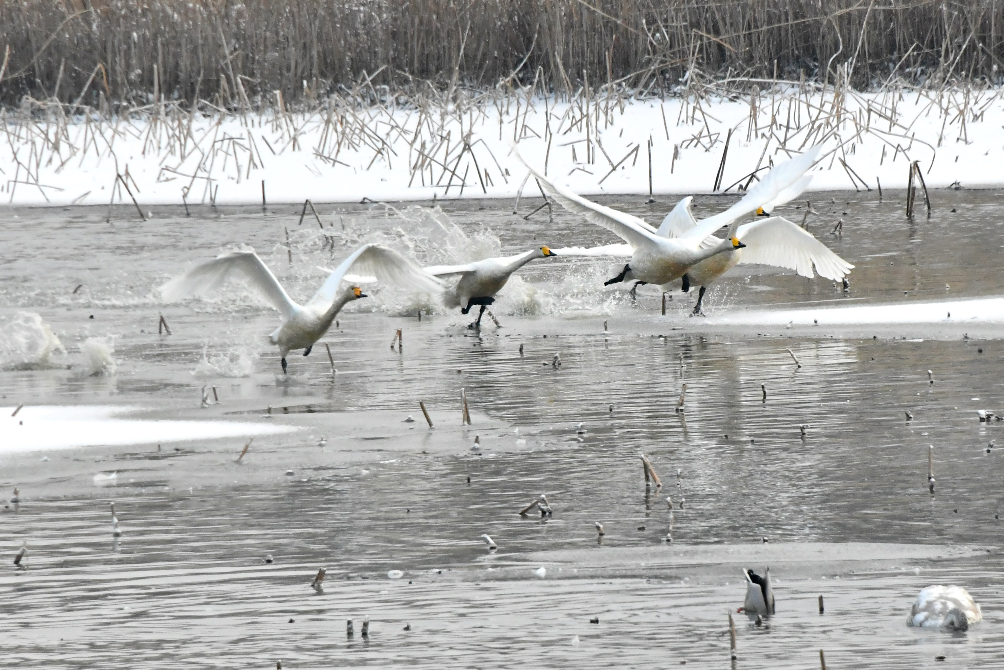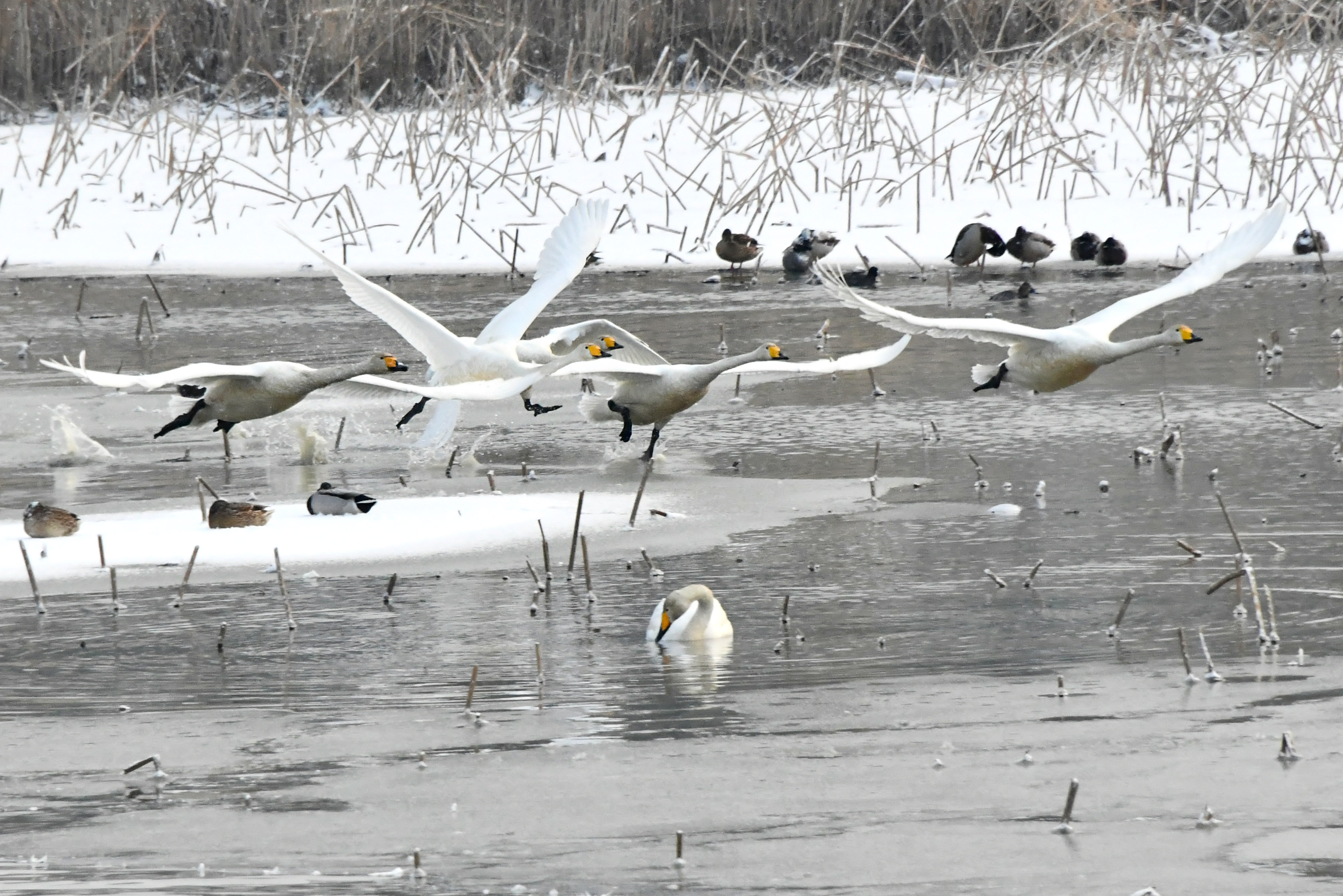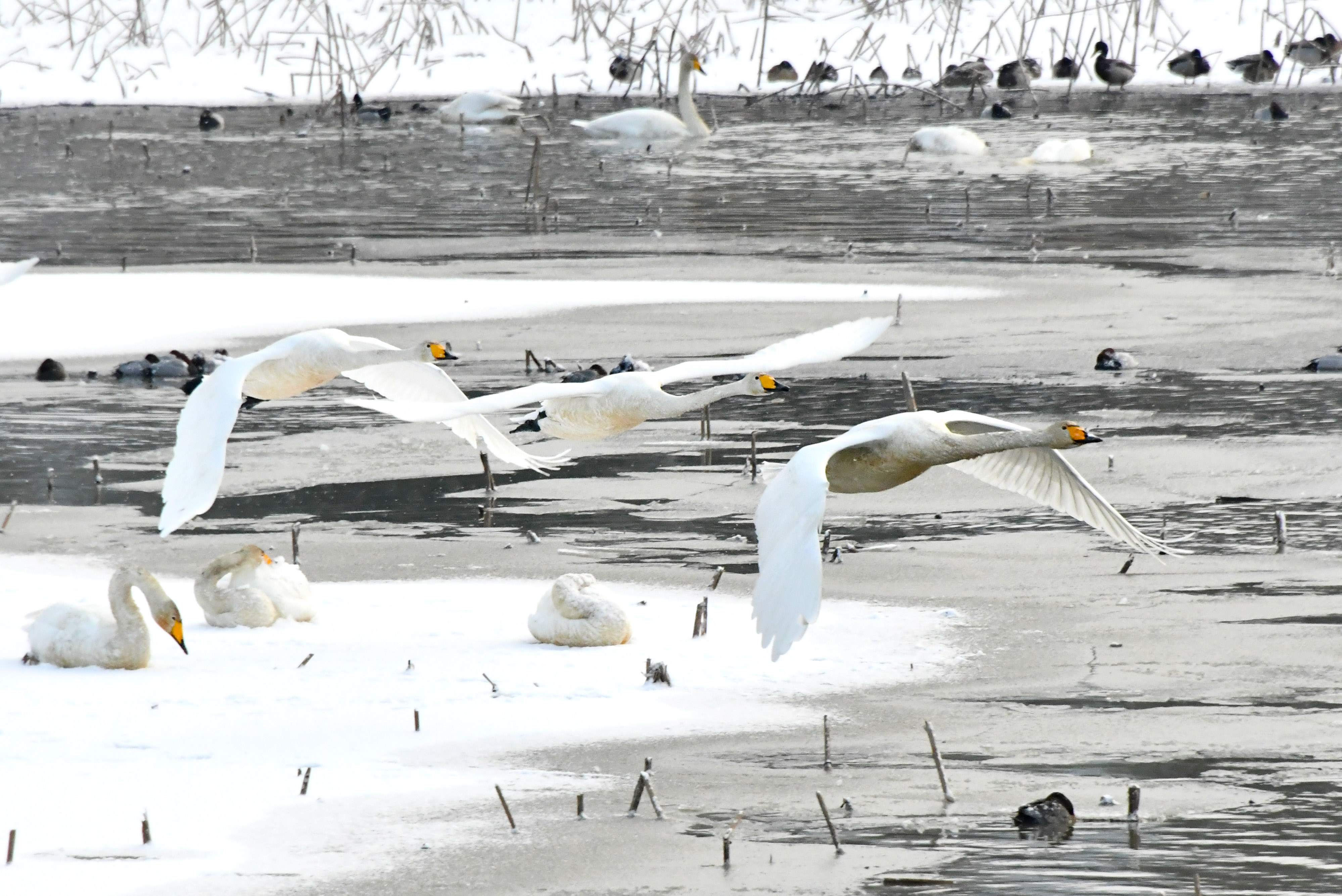 한번에 많이씩 날아 렌즈속에서 잘린 고니들이 수두룩